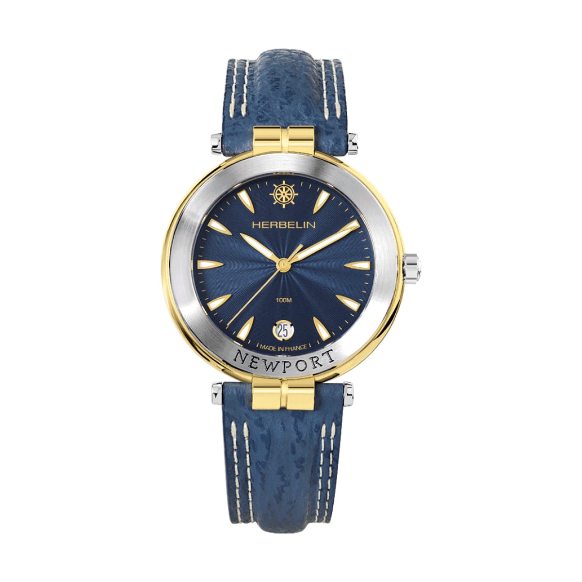 Inspirée par les hublots de navires transatlantiques et dotée d’une forte personnalité, Newport est le modèle phare de la Maison Herbelin. Cette montre Newport est singulière de par ses attaches et l’alliance du PVD or jaune et de l’acier habillant son boitier. Son cadran bleu intense marqué d’une roue de marine à midi rend cette pièce Herbelin unique. Elle habille les courbes des poignets masculins avec distinction.