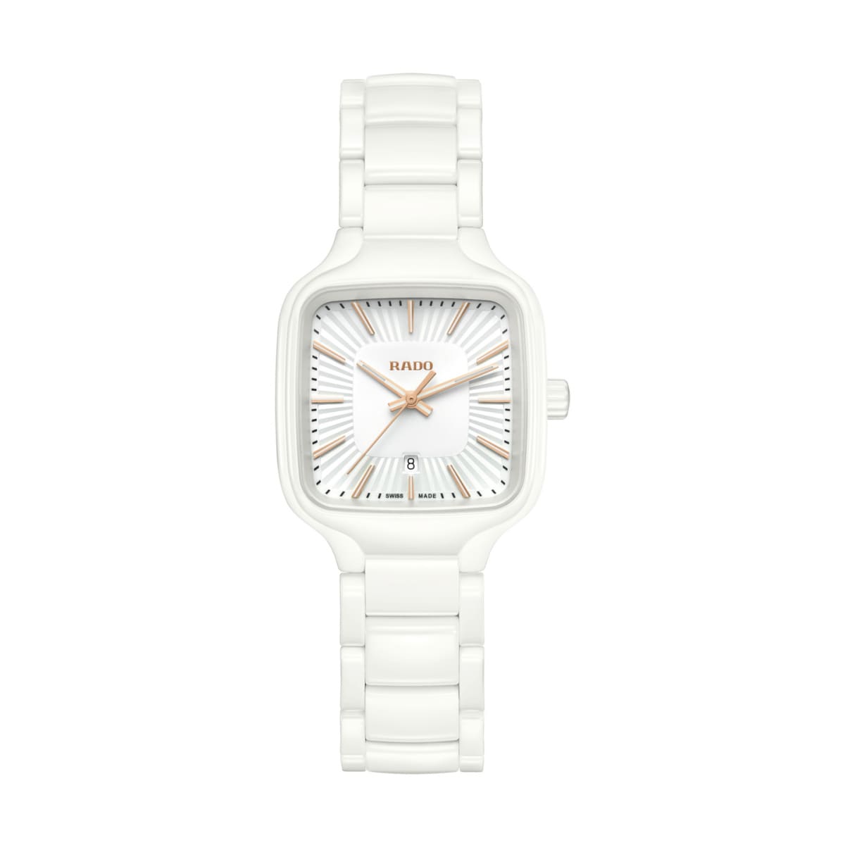 La True Square possède un diamètre de 29 mm et se compose d’un boîtier et d’une couronne en céramique haute technologie blanche polie, ainsi que d’un verre saphir plat. Grâce à son mouvement à quartz Rado R079, cette montre indique l’heure de manière fiable et précise. Les aiguilles et les index couleur or rose avec Super-LumiNova® blanc se marient parfaitement avec le cadran qui inclut une structure blanche estampée et plissée radialement. La True Square est étanche jusqu’à 5 bar. Son port très agréable est garanti par un bracelet en céramique haute technologie blanche polie avec boucle déployante triple en titane.