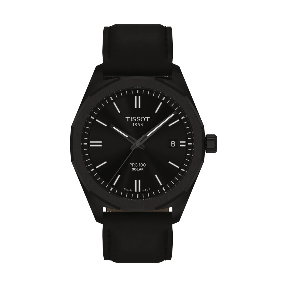 Prix de vente conseilléLa Tissot T-Classic PRC 100 Quartz Solaire est résolument moderne avec son boîtier en acier PVD noir et sa lunette dodécagonale en PVD noir elle aussi.